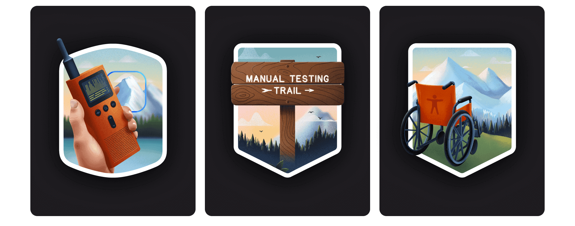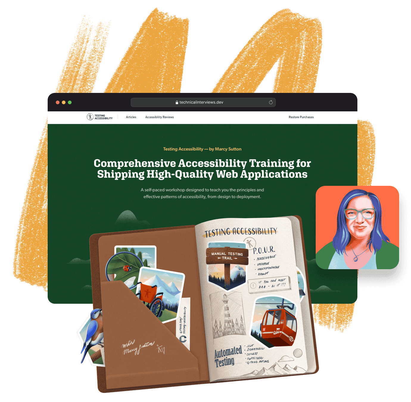 Michelle created all the delightful illustrations, helping translate the concepts taught in Testing Accessibility into a hiking/camping visual narrative.