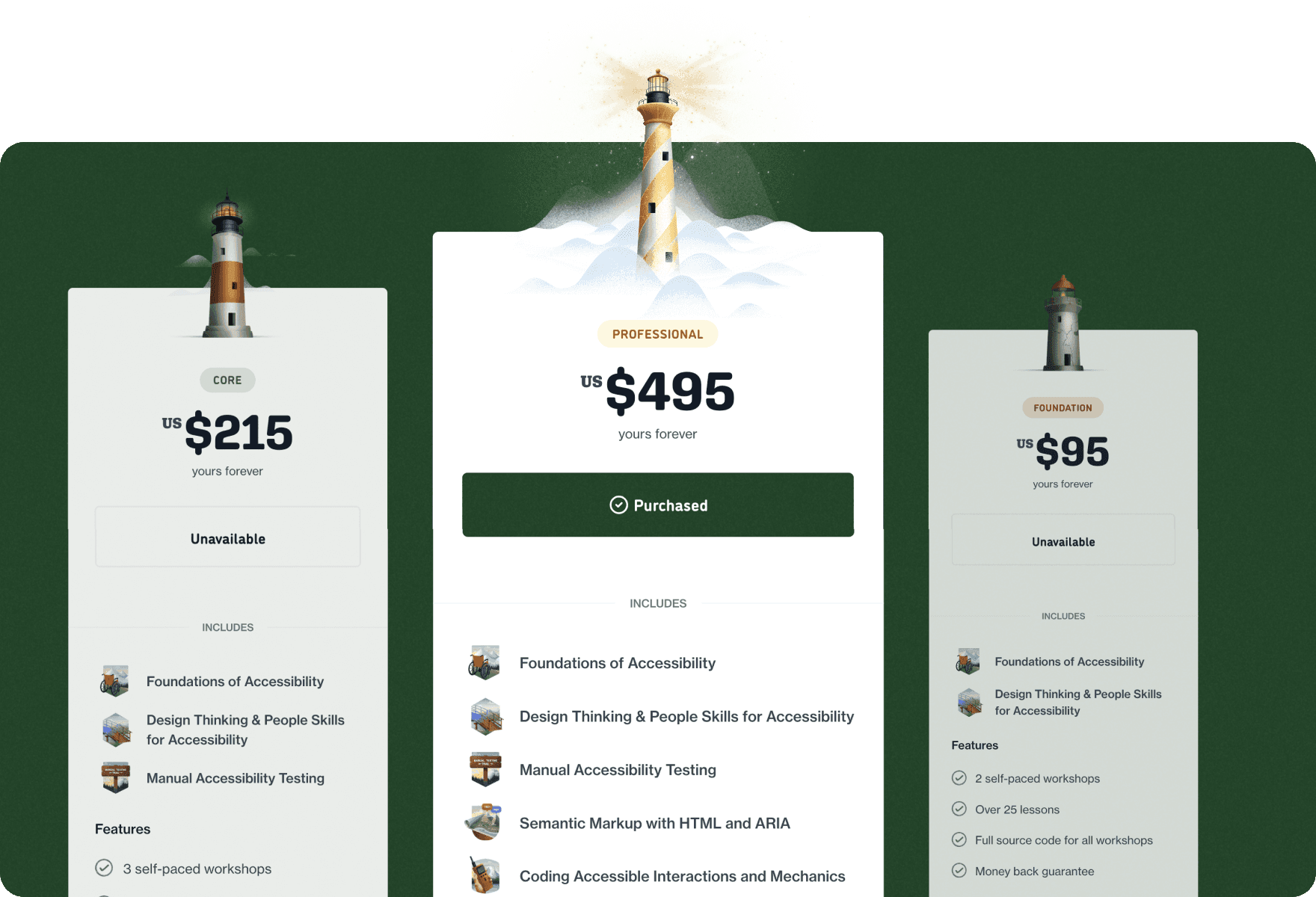 With six modules of content, we decided to go with a three-tiered approach for the launch: Foundation (2 modules included), Core (3 modules included) and Professional (all 6 modules).