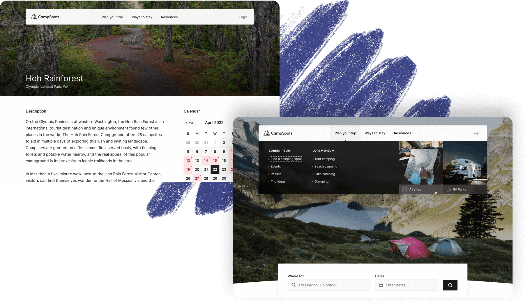 Marcy had the idea of building a travel booking website, which has a lot of components to use as learning examples (e.g. menu, date picker, map, photo gallery). Marcy is big on camping and a lot of outdoor activities, so it was a natural fit to make the app camp-themed.